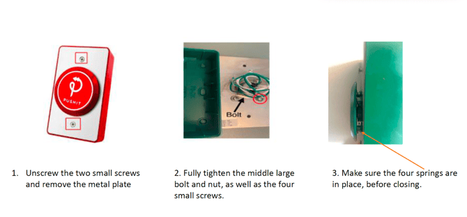 Fully tighten the middle large bolt/nut and the four small screws, then loosen each of them by one full turn - test the button and confirm it is clicking.